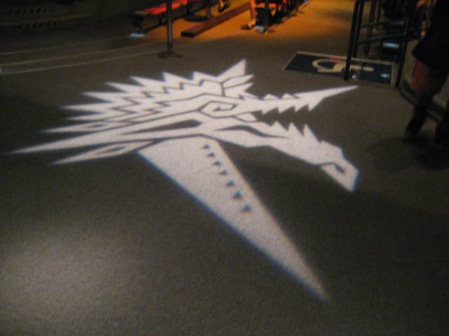 展示スペースに向かうところの床にジンオウガアイコンのスポットライトが